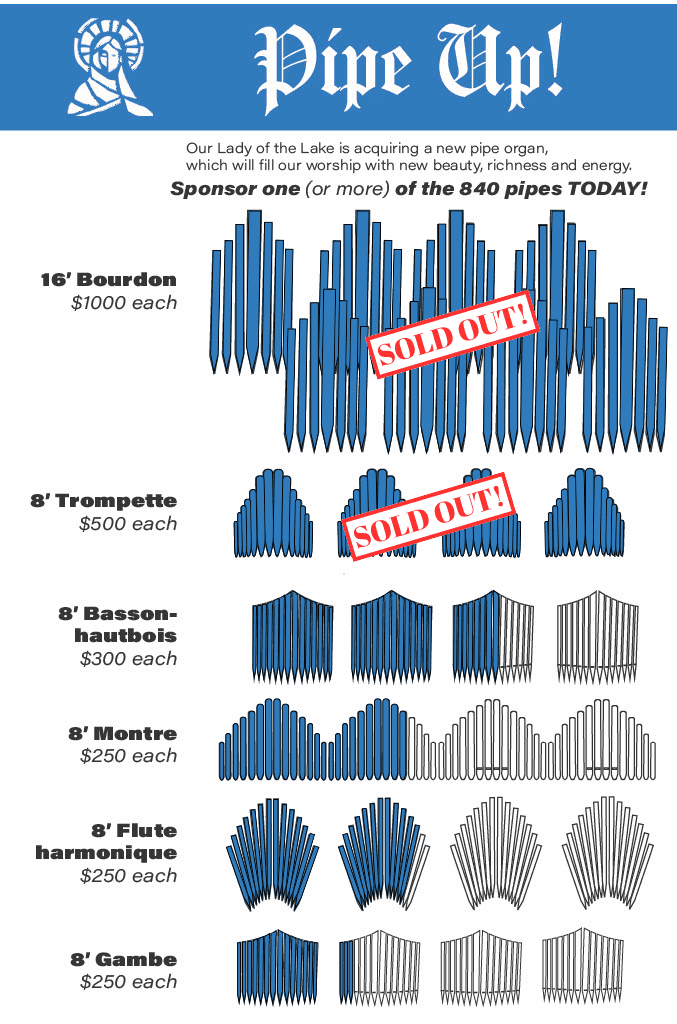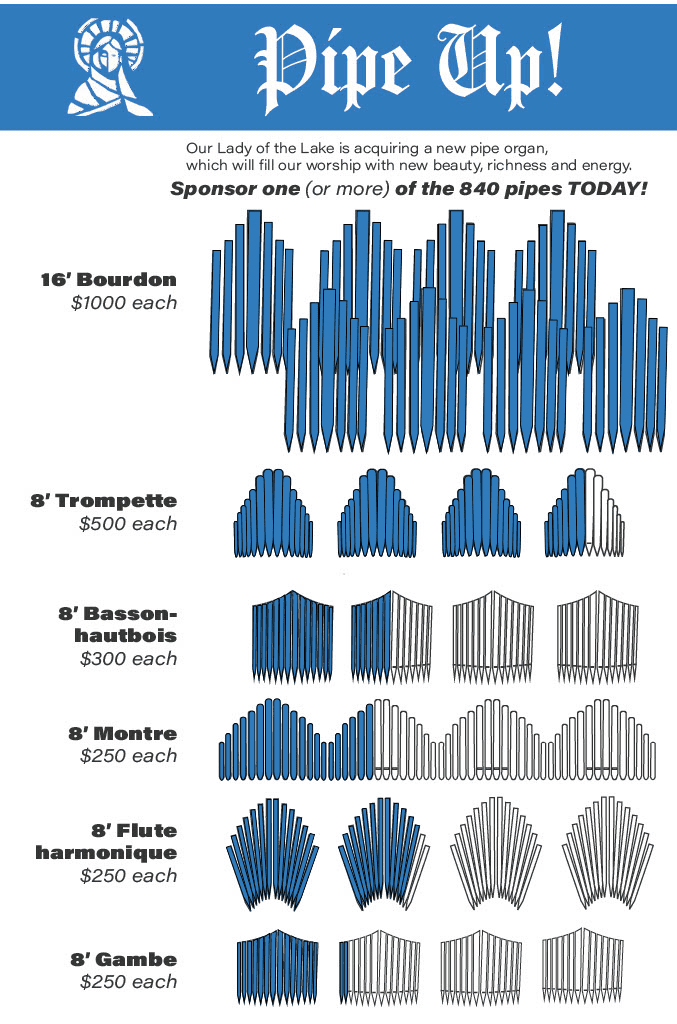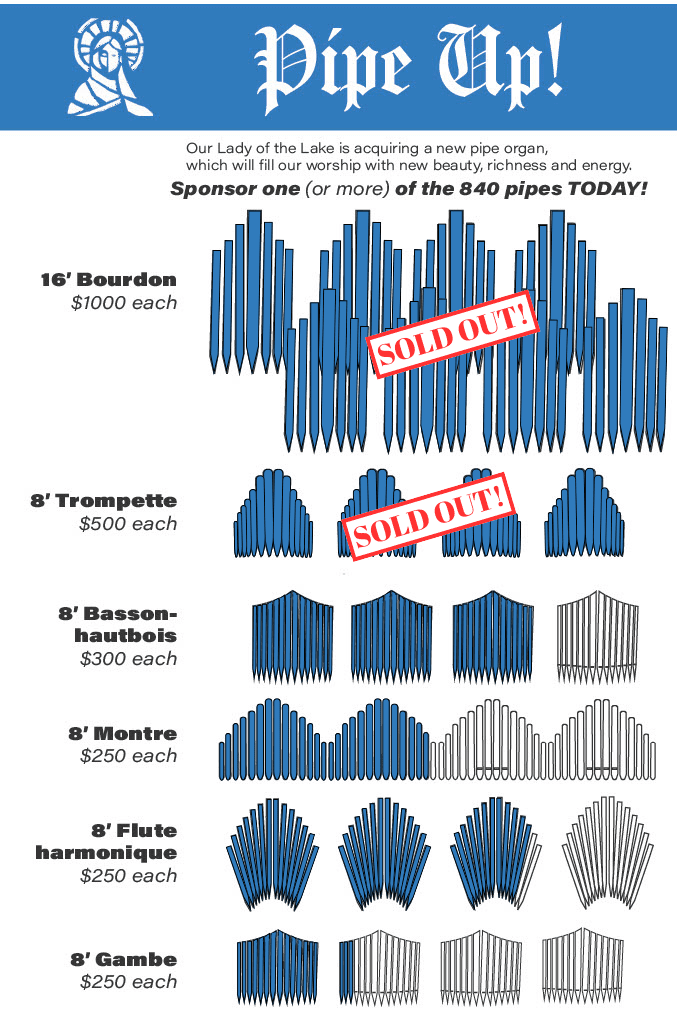 According to the Constitution on the Sacred Liturgy of the Second Vatican Council, “The pipe organ is to be held in high esteem in the Latin Church, since it is its traditional instrument, the sound of which can add a wonderful splendor to the Church’s ceremonies and powerfully lift up men’s minds to God and higher things.” At Our Lady of the Lake, we are excited to announce that we are on the verge of acquiring our very own pipe organ to replace our current electric organ and elevate the beauty of our liturgies.