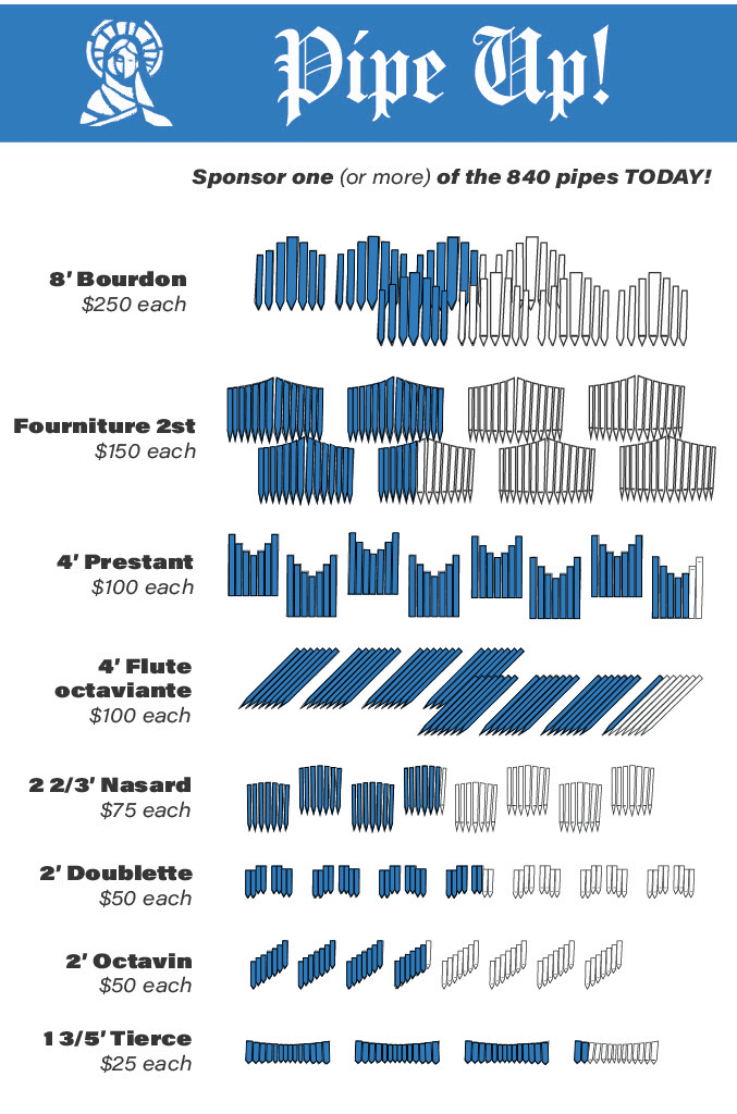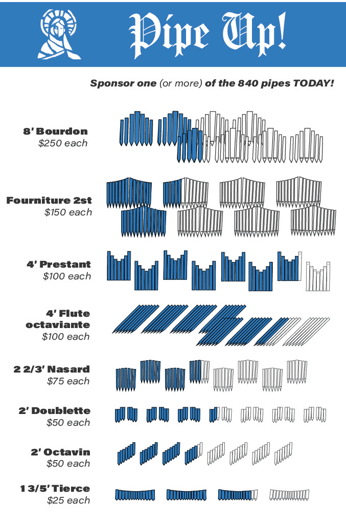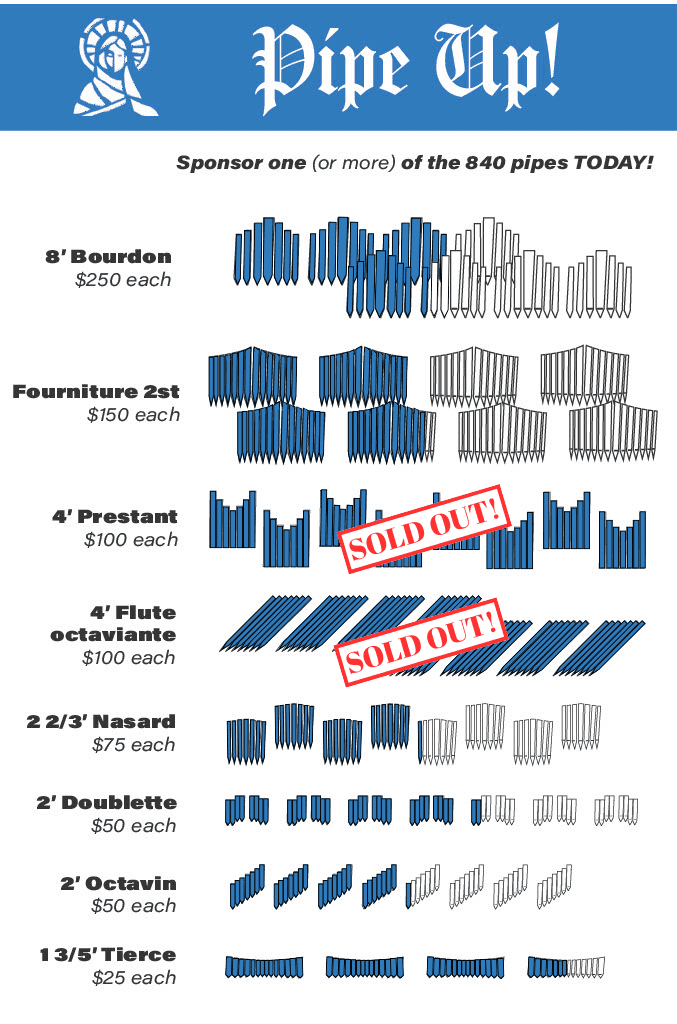 We are inviting everyone in the parish to buy a pipe! There are 840 organ pipes in our new organ. We ask you to prayerfully consider purchasing a pipe (or several pipes!) to help us ensure that this magnificent instrument will inspire and uplift our congregation for many years to come. Download the form for more information on the available pipes and the different levels of giving, or give online!