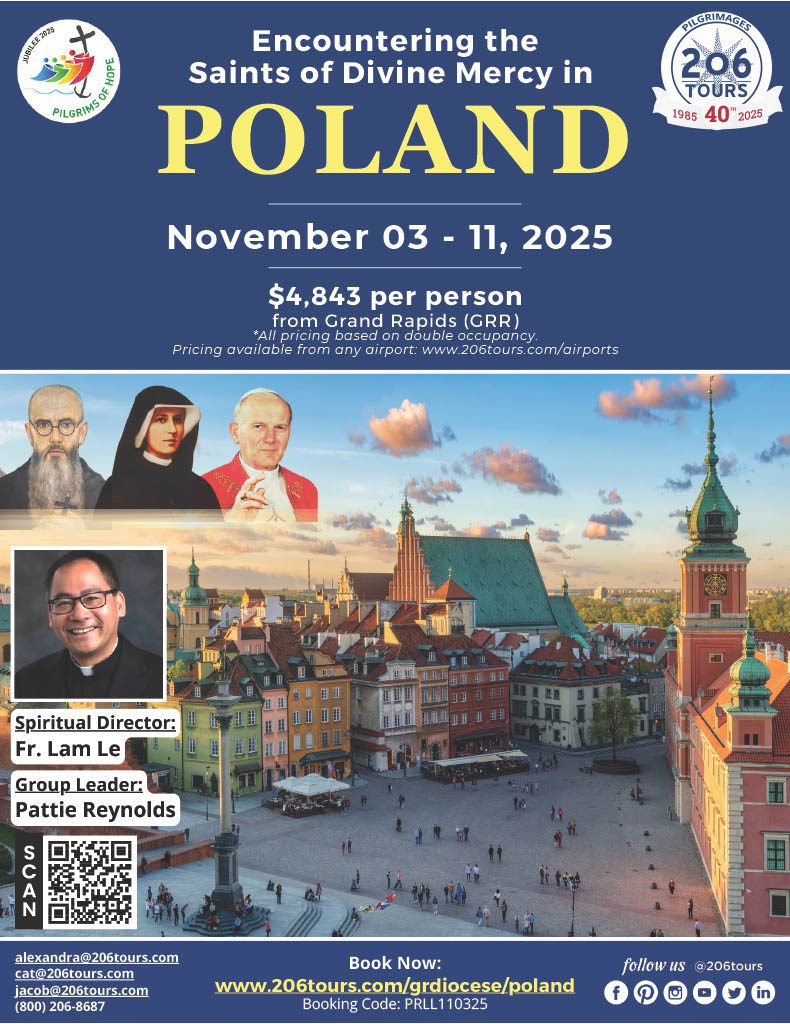 Catholics who make a pilgrimage to Rome during the 2025 Jubilee Year can obtain a plenary indulgence by visiting at least one of the four major papal basilicas. In addition, an indulgence can be obtained by spending time in prayer in several other churches in Rome. Catholics can also gain a plenary indulgence by making a pious pilgrimage to their cathedral or to another church or shrine selected by the local bishop. Within our Diocese, the Cathedral of St. Andrew in Grand Rapids has been designated as a local pilgrimage location.