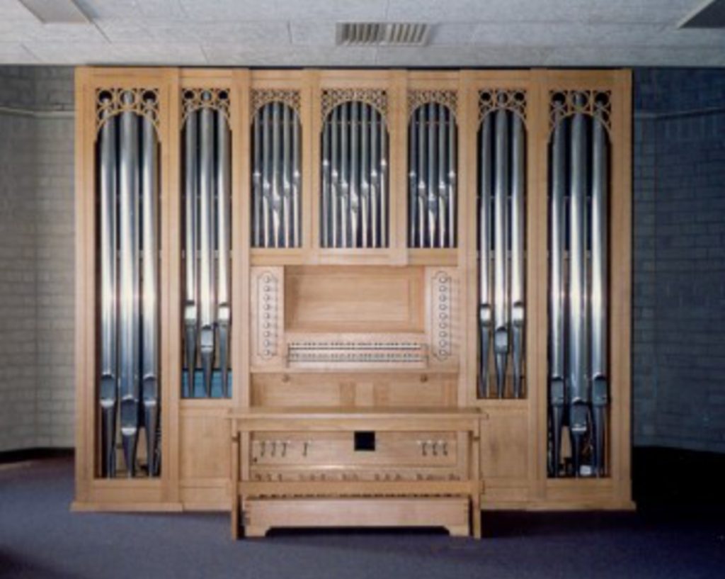 Our pipe organ, Opus 934, was built by Pels & Van Leeuwen in 1993. This organ was initially designed and scaled to be installed in a larger room, but was purchased by the Municipal Music School in Eindhoven, the Netherlands. To make it usable in the school’s classroom, they built a completely closed case of solid oak. The sound could only enter the room through the openings between the largest facade pipe fields to the left and right of the console. This allowed the organ to produce a powerful sound while maintaining a comfortable environment for teaching and practicing in a small study room for extended periods of time.