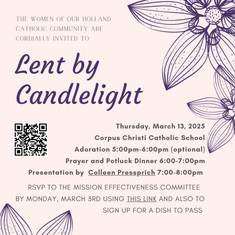 The women of Holland and Zeeland are invited to attend Lent by Candlelight, an evening of reflection and prayer led by Mrs. Colleen Pressprich. Join us on Thursday, March 13, at Corpus Christi Catholic School for a night of fellowship and prayer for women in our community. RSVP by Monday, March 3, and sign up for a dish to pass.