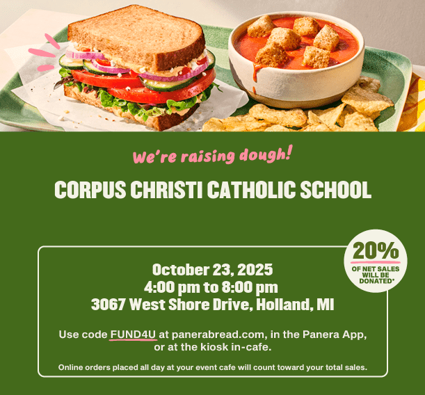 Head to Panera Bread on Thursday, October 23, from 4:00 to 8:00 p.m., and show the flyer below to have 20% of your sales donated toward Corpus Christi Catholic School!