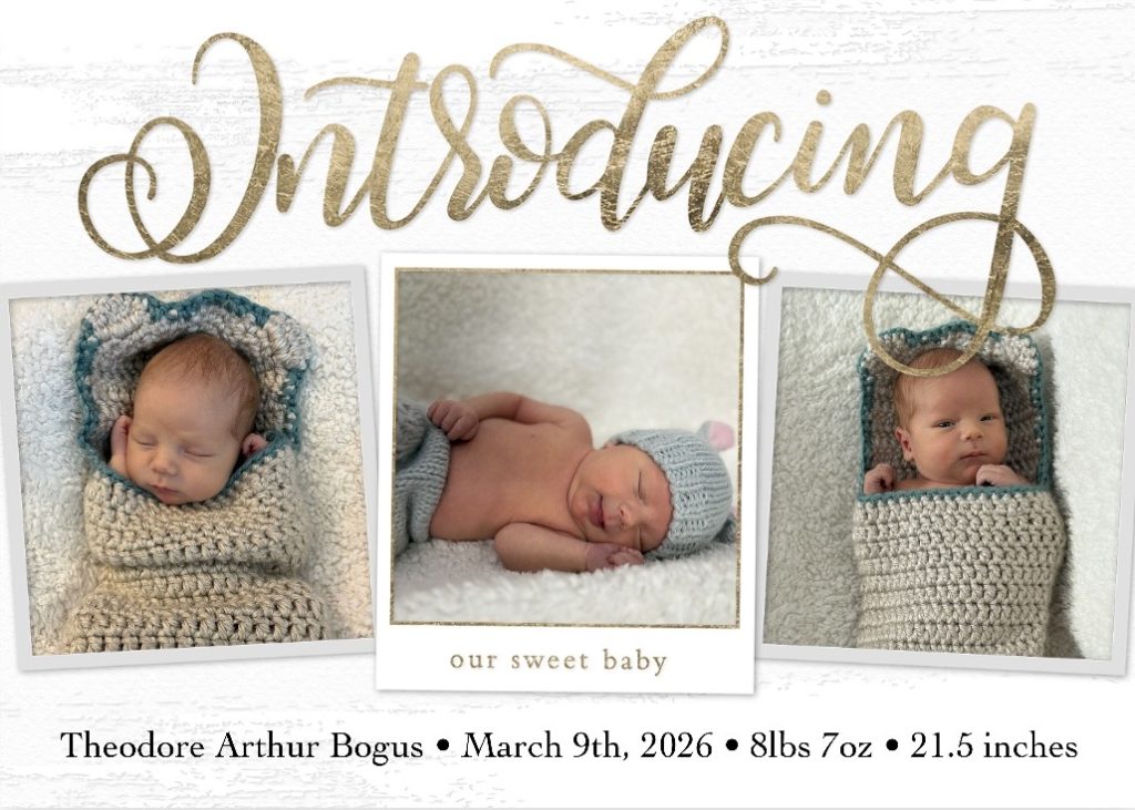 Casey and Stephanie Bogus welcomed their son, Theodore (Teddy) Arthur Bogus, on March 9, 2026. He weighed 8 pounds 7 ounces and measured 21.5 inches long. Consider blessing the Bogus family with a meal and with prayers!